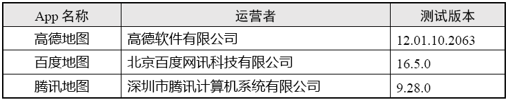 本次测试选取了19家应用商店⁽¹⁾累计下载量达到5000万次的“地图导航类”App,共计3款,其基本情况如表1。