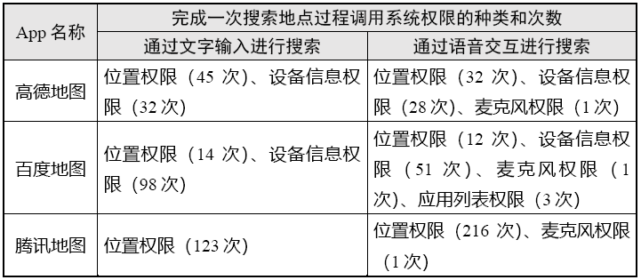 (2)在搜索地点场景中,通过文字输入方式进行搜索时,调用系统权限种类最多的为高德地图和百度地图(均为2类),调用系统权限次数最多的为腾讯地图(123次);通过语音交互方式进行搜索时,调用系统权限种类最多的为百度地图(4类),调用系统权限次数最多的为腾讯地图(217次)。具体情况如表3。