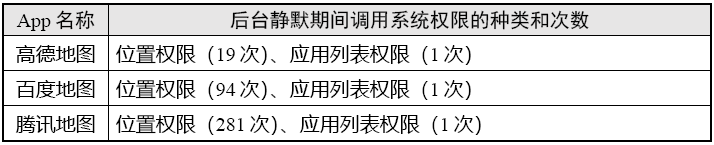 (4)在后台静默场景中,3款App调用系统权限种类均为2类,调用系统权限次数最多的为腾讯地图(282次)。具体情况如表5。
