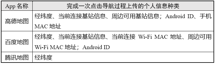测试发现,3款App上传了5种类型个人信息:①位置信息,包括经纬度、街道地址、当前连接Wi-Fi MAC地址、当前连接基站信息、周边可用基站信息、周边可用Wi-Fi MAC地址;②唯一设备识别码,包括Android ID(安卓ID)、手机MAC地址;③剪切板内容信息,主要是地点分享链接;④应用列表信息,包括手机上已安装、新安装和新卸载的应用信息;⑤地点信息,主要是地点名称,包括文本或语音形式。