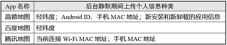 (4)在后台静默场景中,个人信息上传种类最多的为高德地图(3类)。具体情况如表9。