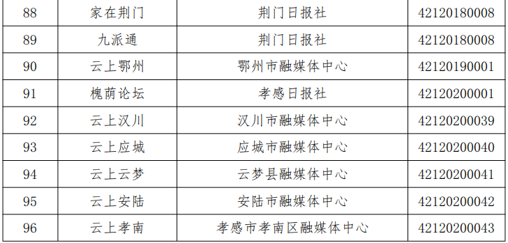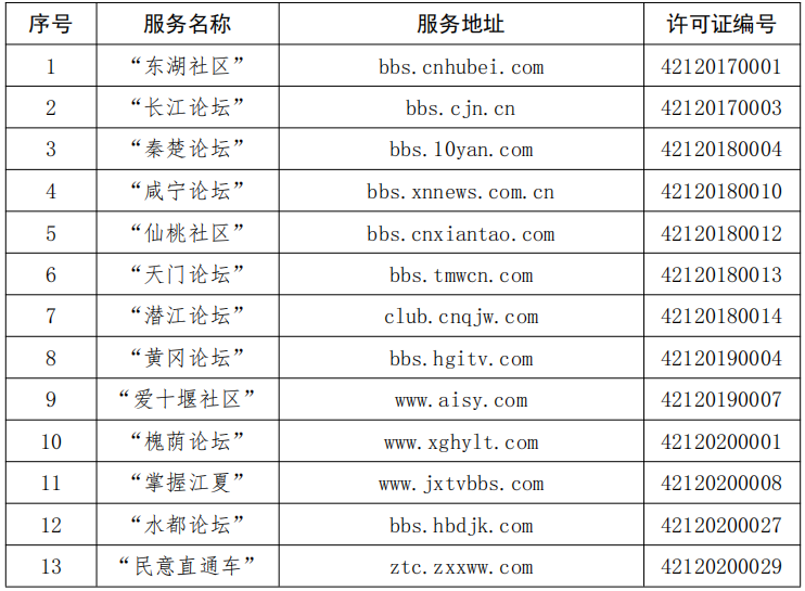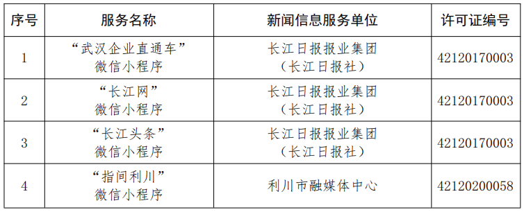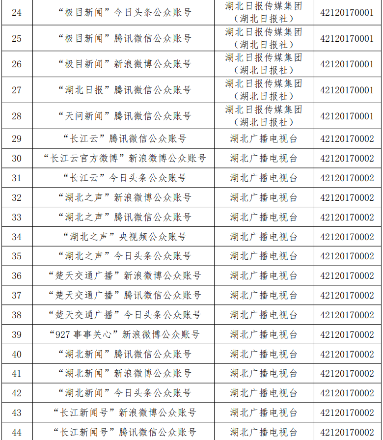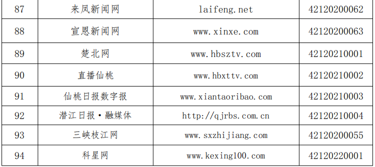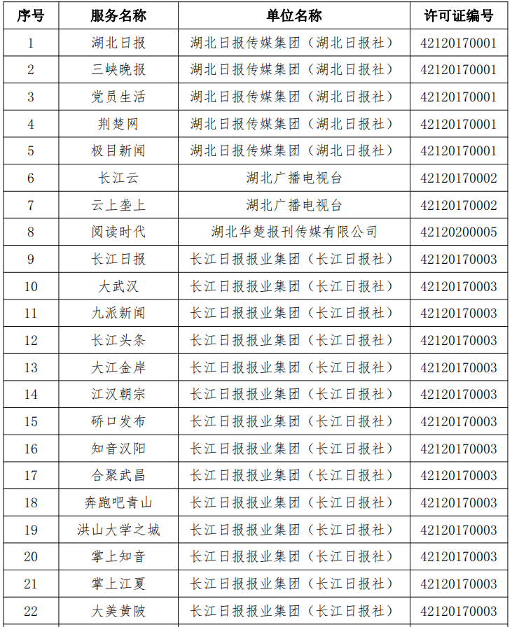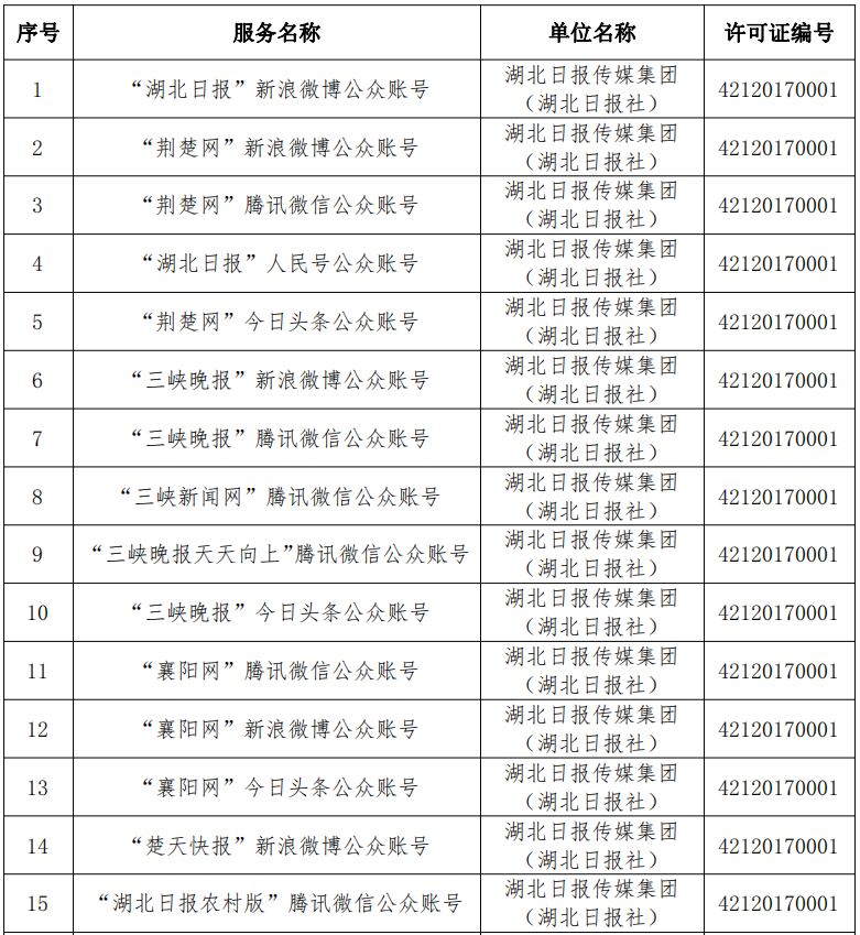 按照国家网信办的统一部署,湖北省网信办依法组织开展了属地互联网新闻信息服务许可证的申请、续办和变更工作,现将已完成申请、续办和变更的111家湖北省互联网新闻信息服务单位取得的相关许可信息予以公开,包括:互联网站94个,应用程序136个,论坛13个,公众账号428个,其他4个,共计675个服务项。