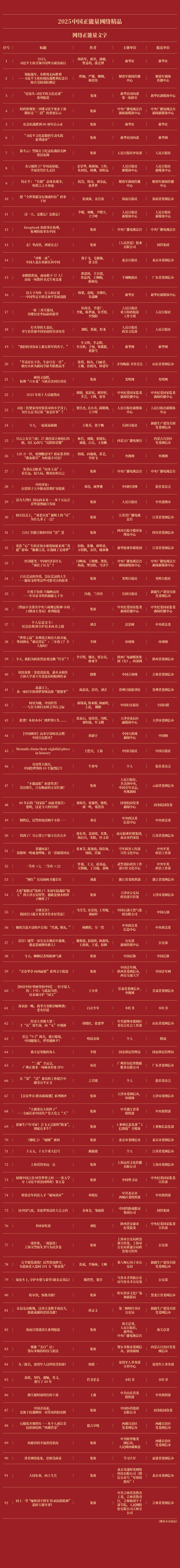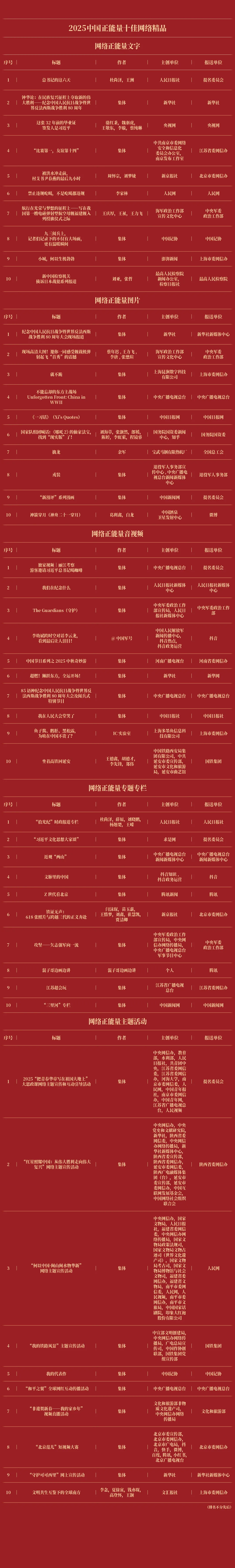 由中央网信办主办的2025中国正能量网络精品征集展播活动今天揭晓结果,经过大众评审、专家评议、评委线上打分和线下评审以及结果公示,50件十佳网络精品及500件网络精品脱颖而出,名单如下: