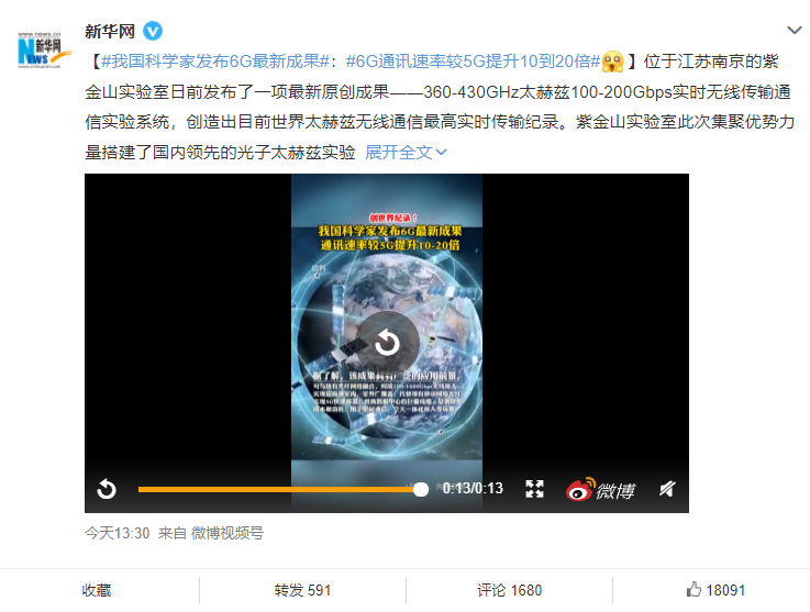我国科学家发布6G最新成果:6G通讯速率较5G提升10到20倍