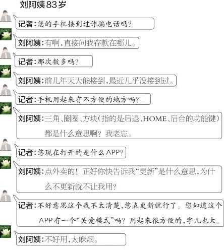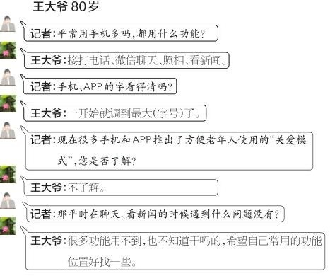 王大爷对记者表示,不管是聊天还是日常接打电话,手机里面很多功能并非老年人所必需的,日常用起来往往觉得界面“乱七八糟”。但是适用于老年人的模式找起来又很麻烦,在听记者介绍之前根本不知道该模式的存在。王大爷身边的很多老年人都对记者表达了相似的看法,“那个是字号大一些,学也学不会,我们用它干吗?”一位阿姨如是说。