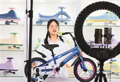 河北省邢台市广宗县铁牛自行车业有限公司的工作人员日前通过线上广交会直播推介童车产品。王 垒摄(人民图片)