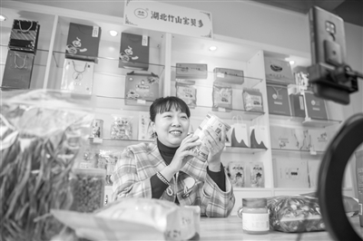 近年来,湖北省竹山县采取培育电商从业人员、引入电商平台、建设直播基地等方式,助力县域产品线上销售。图为工作人员在竹山县电商直播中心直播销售特色农产品。新华社发(伍志尊 摄)