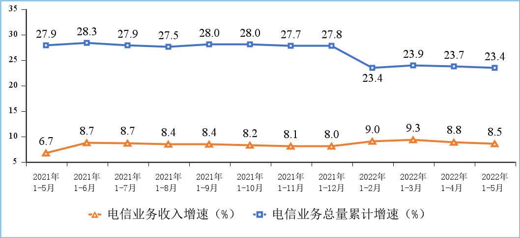 电信业务收入增速稳中有落,电信业务总量保持较快增长。1-5月份,电信业务收入累计完成6650亿元,同比增长8.5%,较1-4月份回落0.3个百分点。按照上年不变价计算的电信业务总量同比增长23.4%,增速较1-4月份回落0.3个百分点。