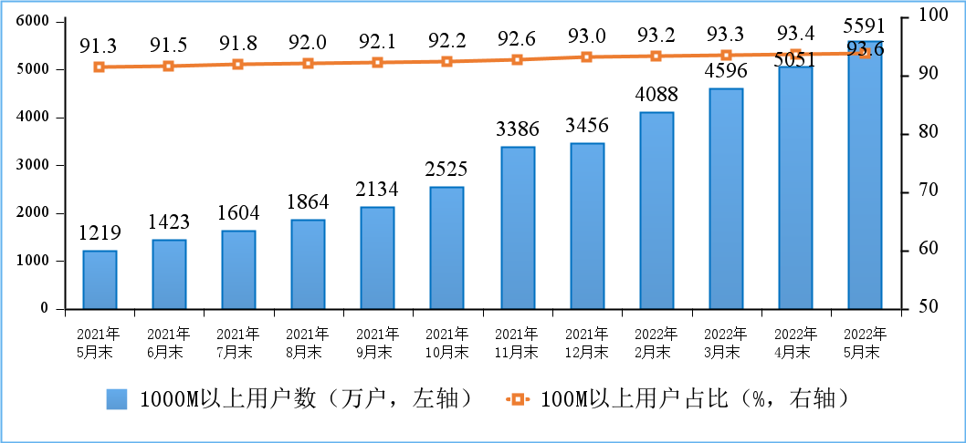 固定宽带接入用户数稳步增加,千兆用户规模快速扩大。截至5月末,三家基础电信企业的固定互联网宽带接入用户总数达5.59亿户,比上年末净增2289万户。其中,100Mbps及以上接入速率的固定互联网宽带接入用户达5.23亿户,占总用户数的93.6%,占比较上年末提升0.6个百分点;1000Mbps及以上接入速率的固定互联网宽带接入用户达5591万户,比上年末净增2135万户。