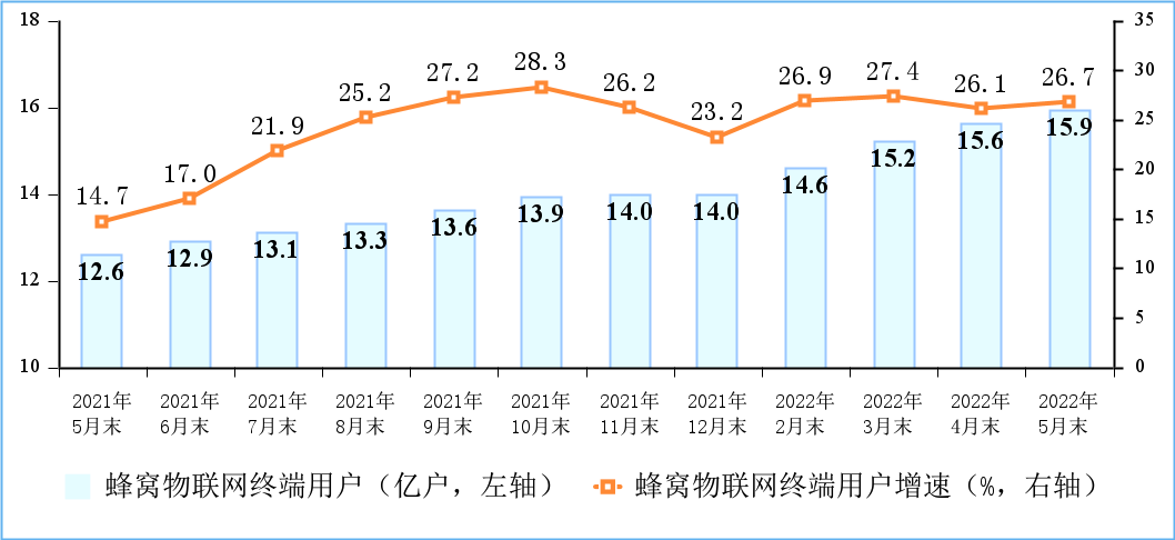 移动网络连接终端中物联网用户占比近半,IPTV用户稳步增长。截至5月末,三家基础电信企业发展蜂窝物联网终端用户15.9亿户,比上年末净增1.96亿户。蜂窝物联网终端用户规模快速接近移动电话用户,两者规模差缩小至6751万户,占移动网终端连接数(包括移动电话用户和蜂窝物联网终端用户)的比重已达49%。IPTV(网络电视)总用户数达3.64亿户,比上年末净增1540万户。