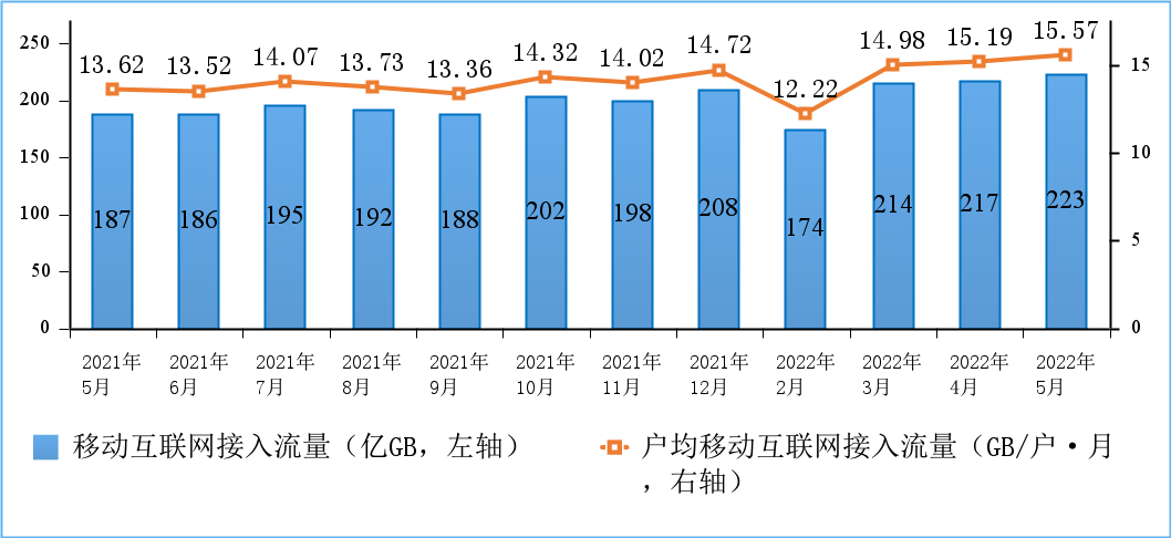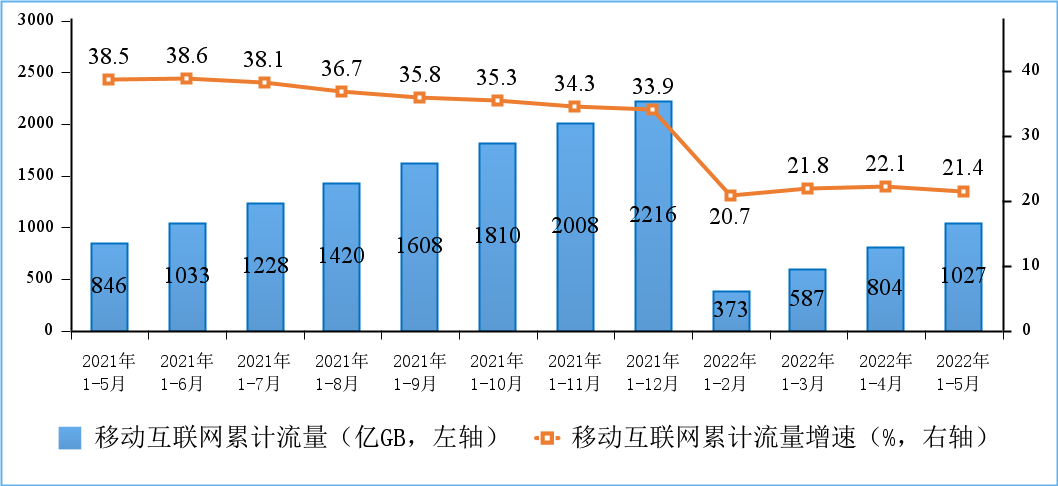 移动互联网流量快速增长,DOU值持续提升。1-5月份,移动互联网累计流量达1027亿GB,同比增长21.4%。截至5月末,移动互联网用户数达14.4亿户,比上年末净增2003万户。5月当月户均移动互联网接入流量(DOU)达到15.57GB/户·月,同比增长14.3%,比上年底高0.85GB/户·月。