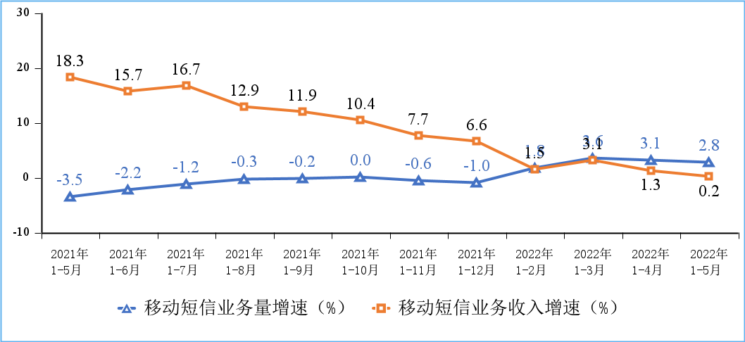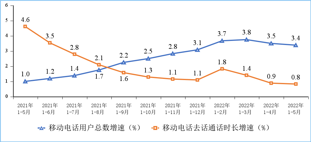 移动电话通话量小幅增长,移动短信业务收入增速持续回落。1-5月份,移动电话去话通话时长完成9278亿分钟,同比增长0.8%;固定电话主叫通话时长完成337.1亿分钟,同比下降13%。1-5月份,全国移动短信业务量同比增长2.8%;移动短信业务收入同比增长0.2%,增速较1-4月份分别回落0.3个和1.1个百分点。