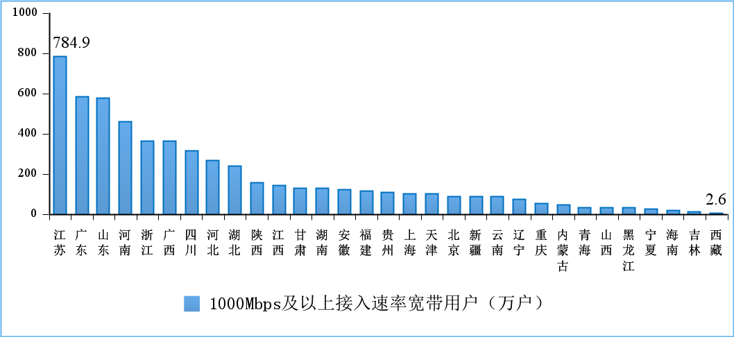 图10 2022年5月份1000Mbps及以上接入速率的宽带接入用户各省情况