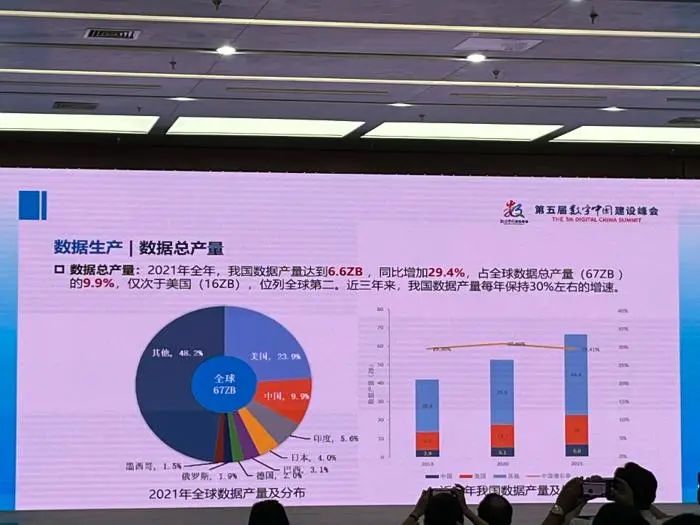 23日,在第五届数字中国建设峰会期间举行的大数据分论坛上,《国家数据资源调查报告(2021)》发布。报告显示,2021年全年,我国数据产量达到6.6ZB,同比增加29.4%,占全球数据总产量(67ZB)的9.9%,仅次于美国(16ZB),位列全球第二。近三年来,我国数据产量每年保持30%左右的增速。