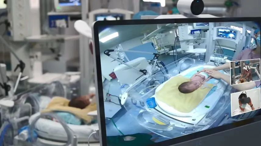 河北医科大学第一医院的医护人员应用VR探视设备为新生儿进行身体检查诊断。