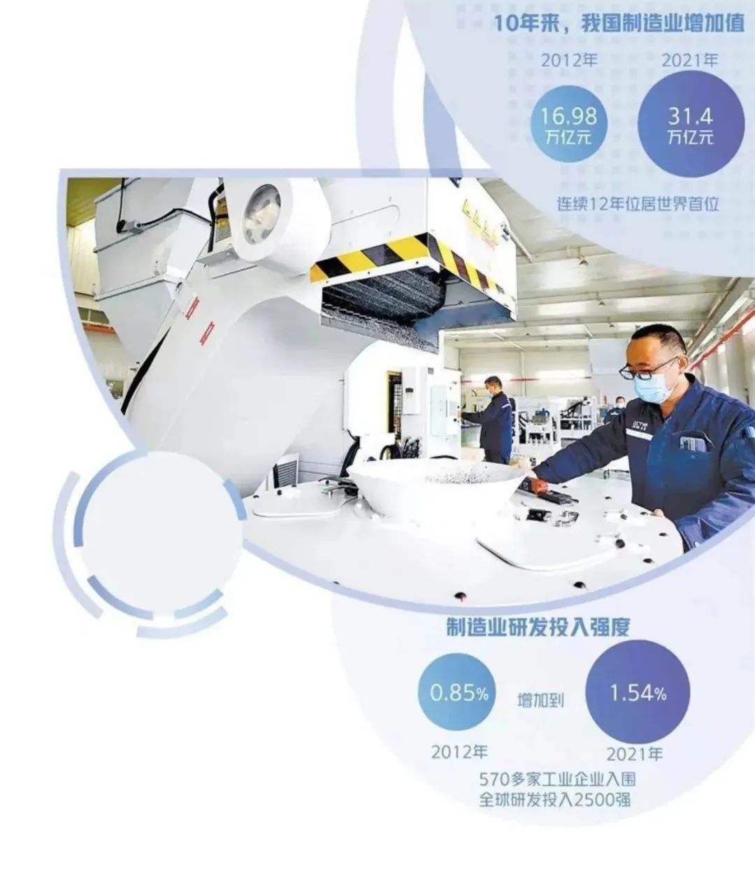 近年来,中国制造向中国创造迈进的步伐明显加快。从创新投入看,我国制造业研发投入强度从2012年的0.85%增加到2021年的1.54%,专精特新“小巨人”企业的平均研发强度达到10.3%,570多家工业企业入围全球研发投入2500强。从创新体系看,我国已布局建设23家国家制造业创新中心和国家地方共建制造业创新中心,支持建设125个产业技术基础公共服务平台,共性技术供给能力大幅提高。从创新成果看,规上工业企业新产品收入占业务收入比重从2012年的11.9%提高到2021年的22.4%,大国重器亮点纷呈,“蛟龙”潜海、双龙探极、C919试飞、“嫦娥”揽月、“北斗”组网、“九章”问世,一大批重大标志性创新成果引领中国制造业不断攀上新的高度。