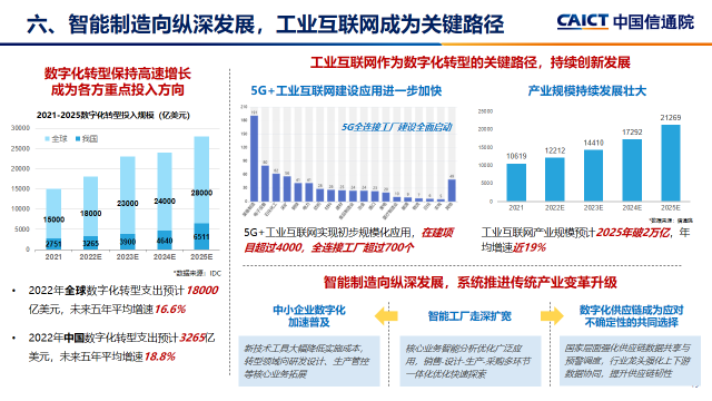 数字化转型保持高速发展态势,工业互联网作为数字化转型的关键支撑和路径,新技术应用、新产业培育日益活跃。5G+工业互联网作为我国重要推进方向,已初步实现规模化应用,工业互联网产业规模也由小到大,预计2025年将超过2万亿。智能制造作为制造业转型升级的主攻方向,全面向纵深发展,智能工厂建设走深扩宽,中小企业加速普及,数字化供应链也成为新的重要探索方向。