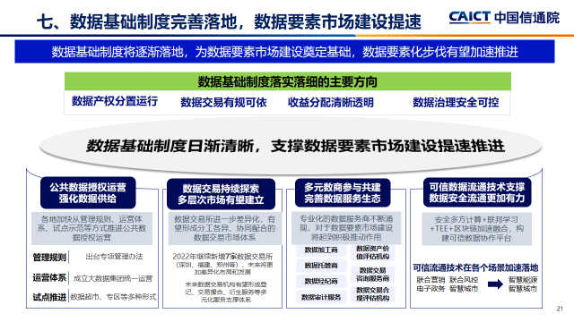 数据要素是数字化发展的基础,2022年12月通过的二十条构建了数字基础制度的相关意见,它的落地为数据要素市场建设奠定了基础。我们会继续加强对数据基础制度细化领域细则的制定,在数据产权、流通交易、收益分配、安全治理等方面进一步细化制度设计。随着数据制度的不断完善,我国数据要素市场建设将进一步提速。