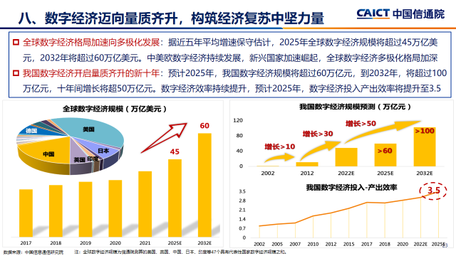 数字经济迈向量质齐升。从国际来看,中美欧数字经济持续发展,新兴国家加速崛起,全球数字经济多极化发展格局将进一步凸显。从国内来看,数字经济正步入量质齐升的新十年,到2025年我国数字经济规模将超过60万亿元,数字经济投入产出的效率将提升至3.5。