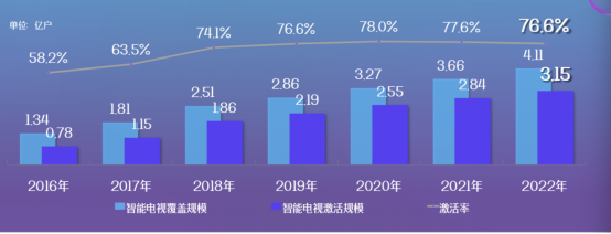智能电视激活终端3.15亿,激活率为76.6%。