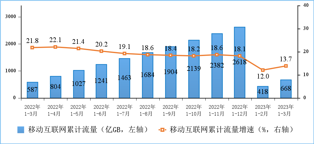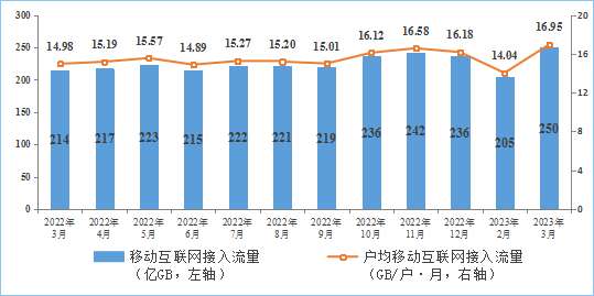 移动互联网流量增速小幅回升,3月DOU值创新高。一季度,移动互联网累计流量达668亿GB,同比增长13.7%,增速较1—2月份提升1.7个百分点。截至3月末,移动互联网用户数达14.8亿户,比上年末净增2857万户。3月当月户均移动互联网接入流量(DOU)达到16.95GB/户·月,同比增长13.2%,较上年12月份高0.77GB/户·月。