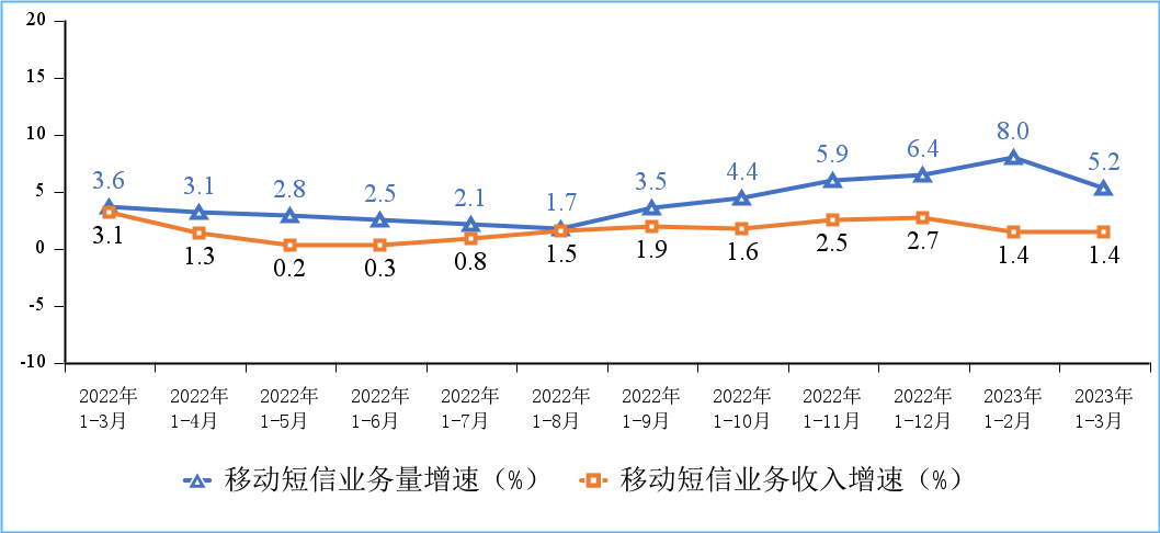 移动电话通话量低速增长,移动短信业务收入保持增长。一季度,移动电话去话通话时长完成5544亿分钟,同比增长1.8%;固定电话主叫通话时长完成188.1亿分钟,同比下降4.5%。一季度,全国移动短信业务量同比增长5.2%,移动短信业务收入同比增长1.4%,增速较上年末分别回落1.2个和1.3个百分点。