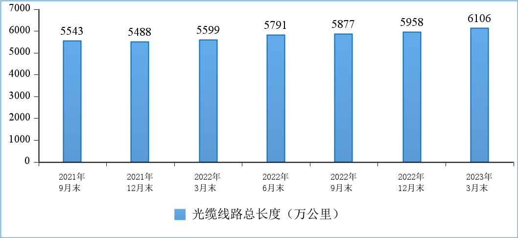 光缆线路总长度稳步增加。截至3月末,全国光缆线路总长度达到6106万公里,比上年末净增148万公里。其中接入网光缆、本地网中继光缆和长途光缆线路所占比重分别为62.5%、35.7%和1.8%,本地网中继光缆比重同比提高2.8个百分点。