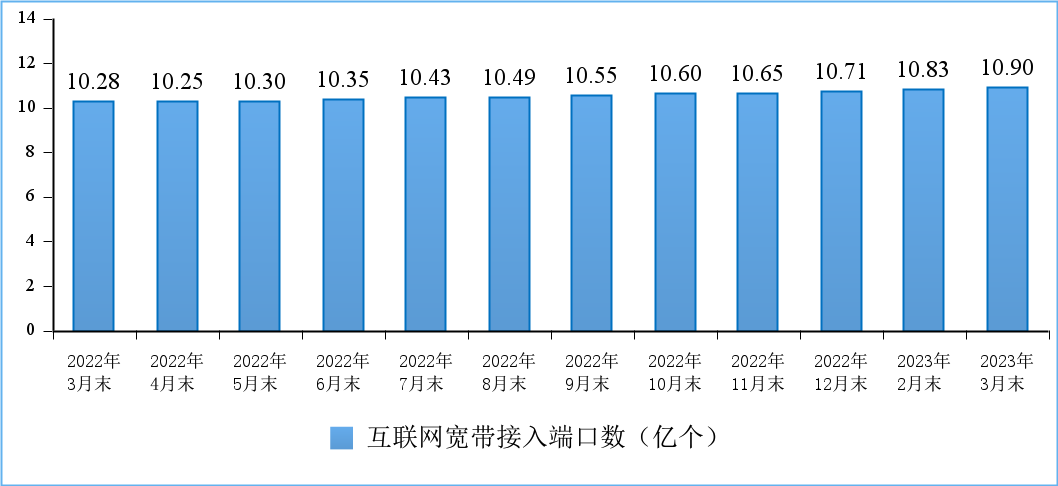 千兆网络服务能力不断提升。截至3月末,全国互联网宽带接入端口数量达10.9亿个,比上年末净增1901万个。其中,光纤接入(FTTH/O)端口达到10.5亿个,比上年末净增2001万个,占互联网宽带接入端口的95.9%。截至3月末,具备千兆网络服务能力的10G PON端口数达1793万个,比上年末净增269.9万个。