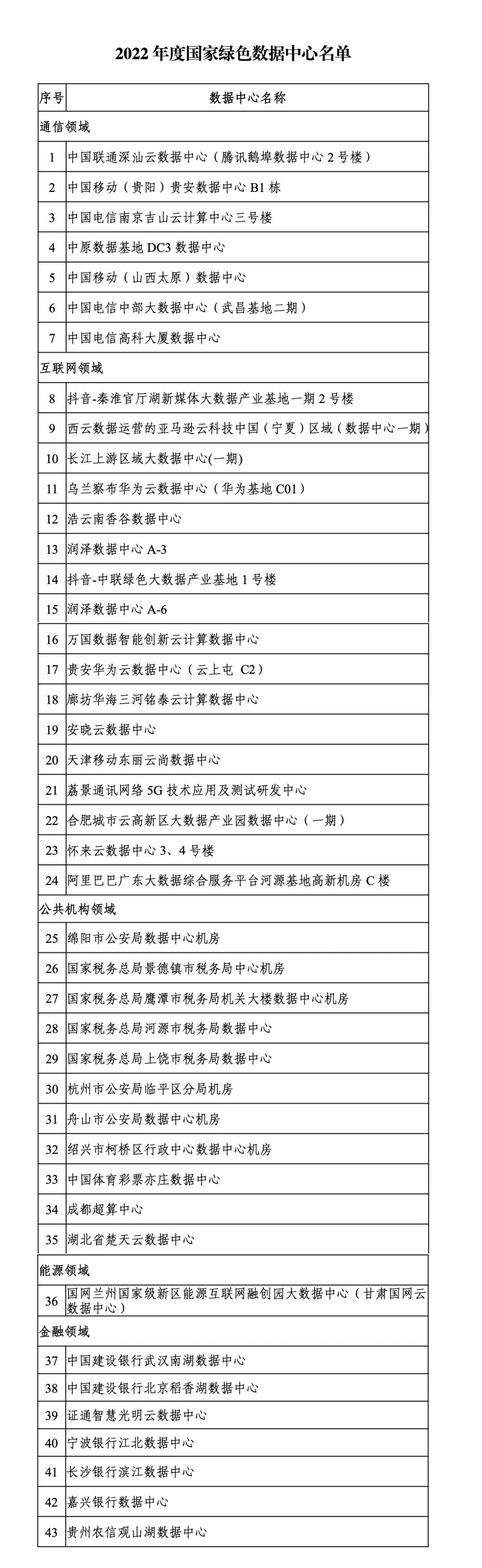 为贯彻落实《“十四五”工业绿色发展规划》,加快数据中心能效提升和绿色低碳发展,引导数据中心走高效、低碳、集约、循环的高质量发展道路,助力实现碳达峰碳中和目标,工业和信息化部、国家发展和改革委员会、商务部、国家机关事务管理局、中国银行保险监督管理委员会、国家能源局确定了43家2022年度国家绿色数据中心,现予公告。
