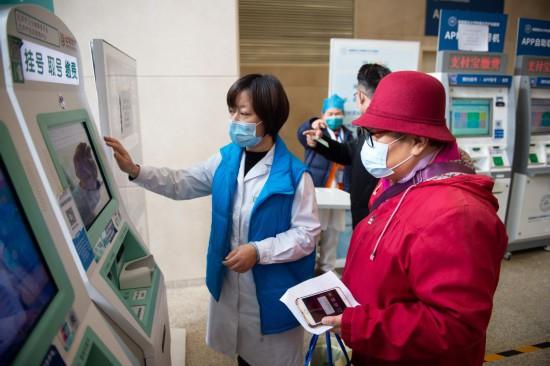 2020年12月9日,在首都医科大学附属北京天坛医院,工作人员在帮助老年人使用自助机查询号源。新华社记者 陈钟昊 摄