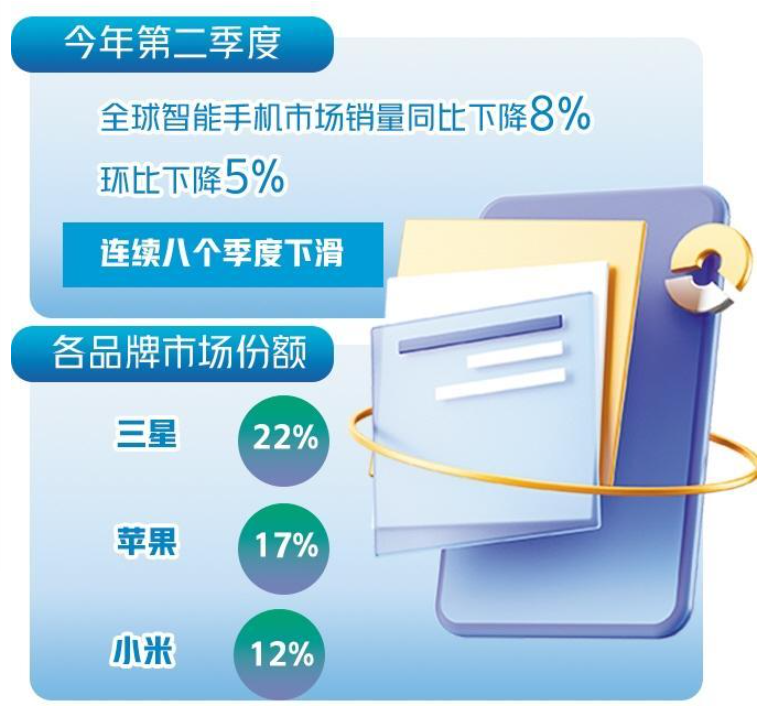 市场调研机构Counterpoint最新研究显示,2023年第二季度,全球智能手机市场销量同比下降8%,环比下降5%,已连续八个季度出现下滑。
