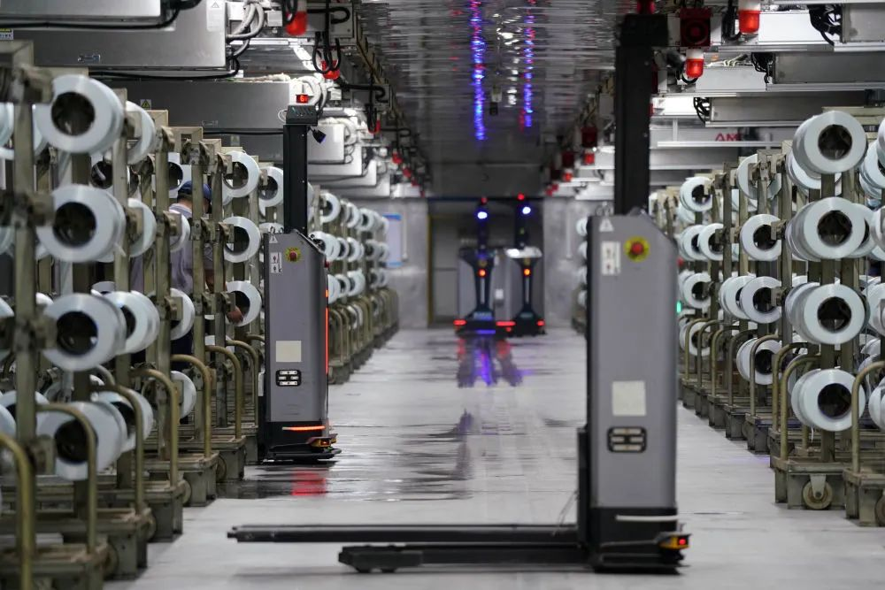 5月18日,在河北沙河市一家玻璃新材料企业,智能搬运车在车间工作。田晓丽 摄