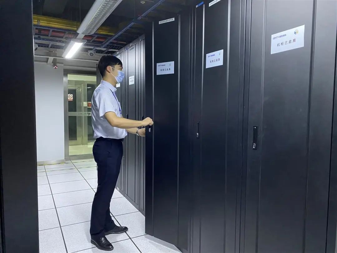 7月13日上午8:30,中国电信中部大数据中心(武昌基地)运维负责人方庆与现场运维人员肖尧开始对机房设备例行巡查。在武昌基地(一期)大楼三楼,一间印有“工业互联网标识解析国家顶级节点(武汉)”标志的机房,两人放慢脚步,仔细巡查。