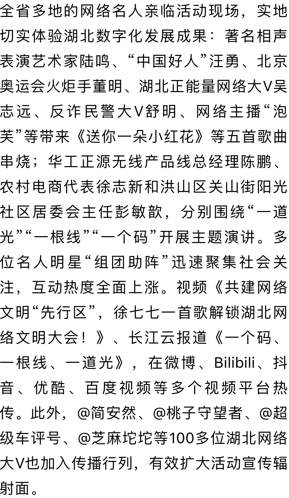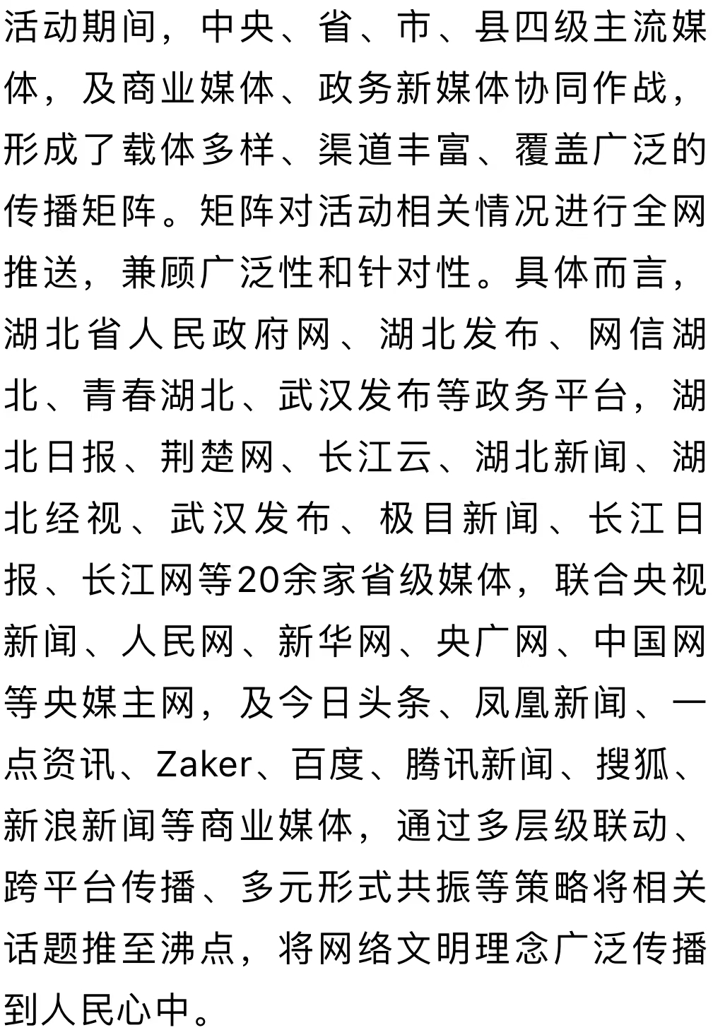 本次活动期间,省内媒体发挥“东道主”优势,在活动前期预热、活动期间跟进及后期解读中全方位展现主流媒体的担当和作为,广泛传播了湖北数字文明建设成果,展现了湖北“让数字文明更好造福人民”的决心和行动。如湖北广播电视台发挥“大屏+小屏”融合传播效应,以立体化传播格局有效扩大了宣传广度和深度。“电视大屏”方面,《湖北新闻》报道《湖北网络文明大会暨全民数字素养与技能提升月启动 让网络文明更好造福群众》,以专业视角和优质内容深入解读活动要义;湖北IPTV大屏端搭建“共享数字成果 共建网络文明”专题页面,并在首页推荐,覆盖750万家庭用户。“移动小屏”上,长江云在客户端、微博、微信、抖音等平台上同步发布活动相关信息,适平台特性提供差异化内容。其中,长江云客户端开设“共享数字成果,共建网络文明”专题,共发布5个专栏、31篇稿件;@长江云官方微博 先后发布9条微博,从活动预告到发起投票引导网民正确认识网络不文明行为,再到发布《湖北省网络文明公约》、会场精彩活动视频等,以图片、文字、视频、投票等多种手段吸引网民关注。“大屏+小屏”融合互通,有效营造了全社会广泛关注并积极参与网络文明建设的浓厚氛围。