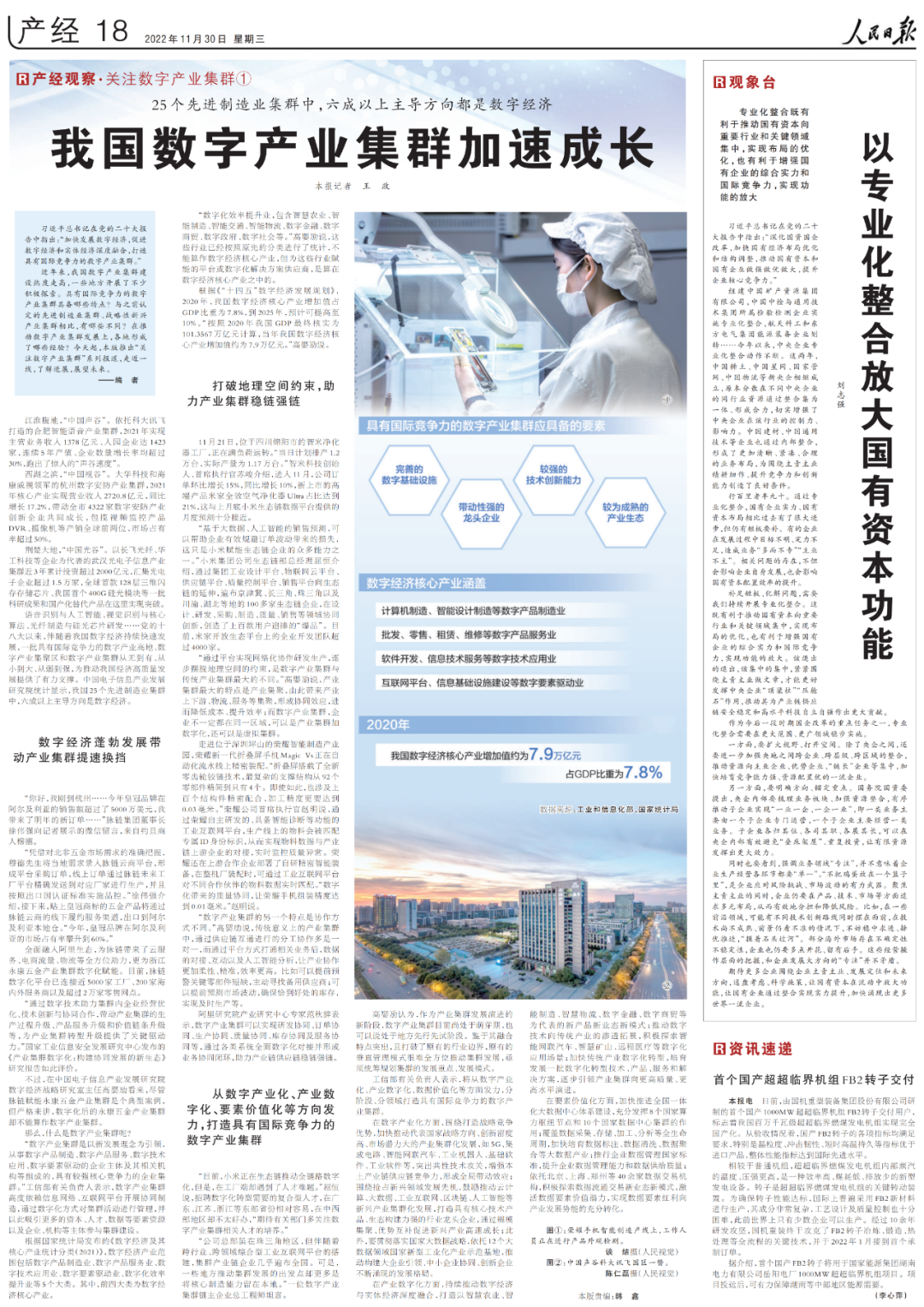 11月30日,《人民日报》以《25个先进制造业集群中,六成以上主导方向都是数字经济——我国数字产业集群加速成长(产经观察·关注数字产业集群①)》为题,报道了武汉在推动数字产业集群发展上的成果与经验。