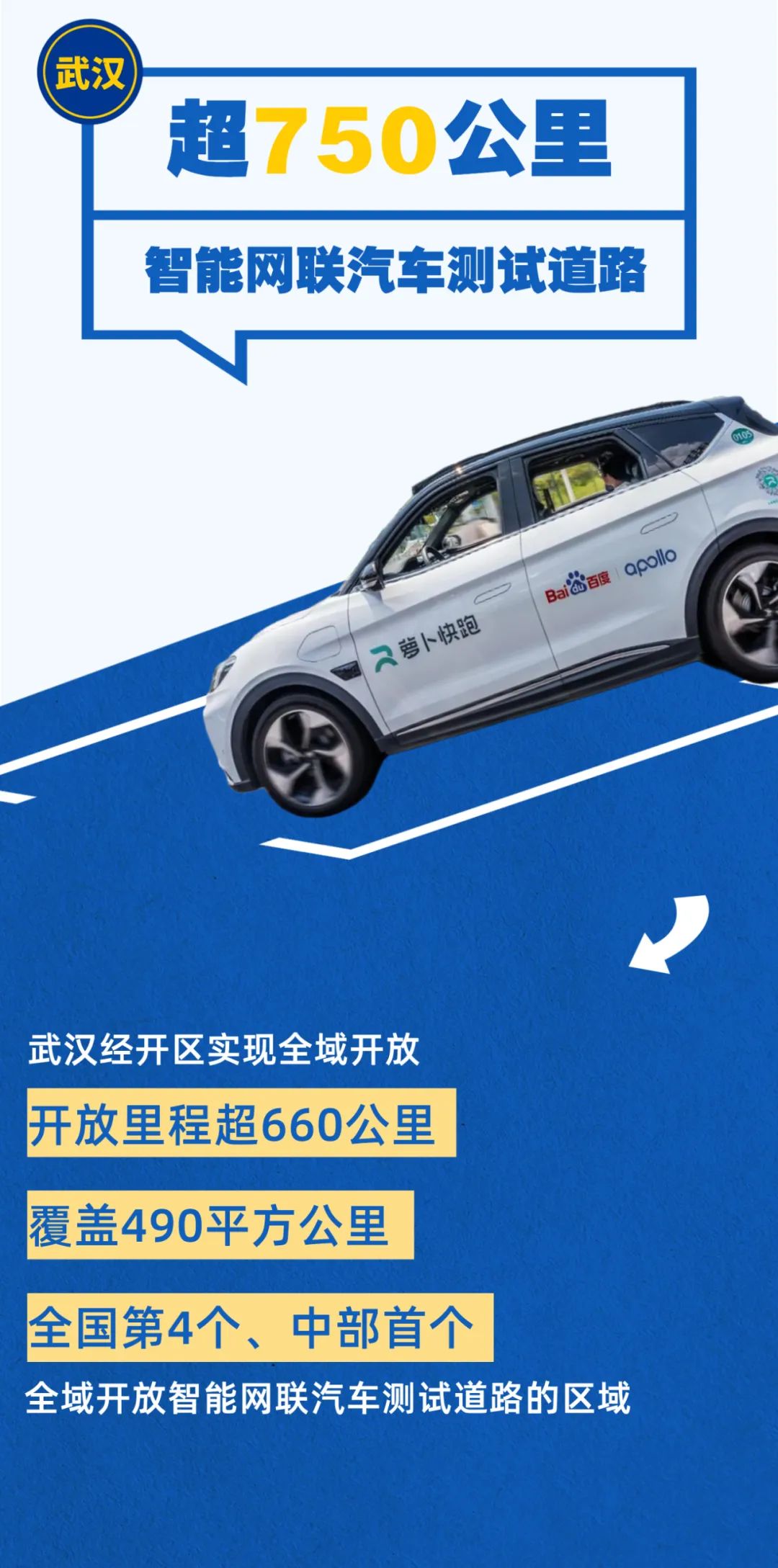 武汉市第五批开放的344公里智能网联汽车测试道路全部位于武汉经开区。目前,该区拥有全市最多的智能网联汽车测试道路,开放里程超660公里,覆盖经开区全域490平方公里,成为全国第4个、中部首个全域开放智能网联汽车测试道路的区域。