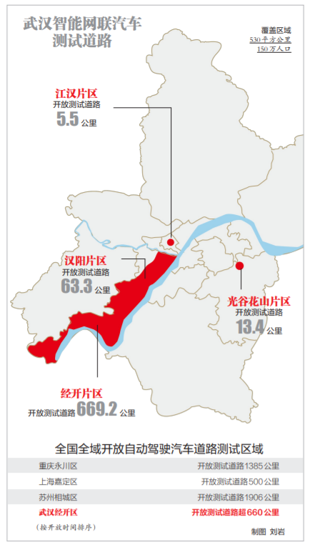 自2019年8月以来,武汉市先后开放了五批智能网联汽车测试道路,开放的测试道路里程超750公里,覆盖武汉530平方公里区域和150万人口,涉及武汉经开区、东湖高新区、江汉区、汉阳区等区域。
