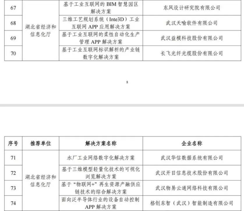 此次我省入围的方案包括东风设计研究院有限公司基于工业互联网的 BIM 智慧园区解决方案、武汉天喻软件有限公司的三维工艺规划系统(Inte3D)工业互联网 APP 应用解决方案、武汉益模科技股份有限公司的基于工业互联网的柔性自动化生产管理 APP 解决方案、长飞光纤光缆股份有限公司的基于工业互联网标识解析的产业链数字化解决方案、格创东智(武汉)智能制造有限公司的面向泛半导体行业的设备自动控制APP 解决方案、中核武汉核电运行技术股份有限公司的面向核电行业维修领域的数字化工作包解决方案、东风悦享科技有限公司的基于 5G 无人驾驶车辆的远程数据监控和控制的 APP 解决方案等,其中有3家公司的项目已连续两年入围。