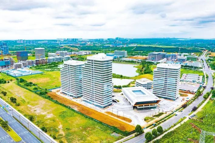 6月5日,俯瞰位于武汉新城核心区的中国光谷·数字经济产业园,园区一期东、西地块已经完成竣工验收。这是响应“数字中国”战略和发展数字经济新兴产业的重点项目,重点发展人工智能、大数据、互联网+、区块链等关键领域。项目规划总用地面积27.6万平方米,总建筑面积约62.7万平方米,建成后将成为国家级数字经济产业高地。 (湖北日报全媒记者 魏铼 摄)