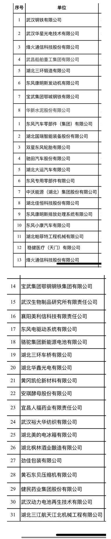 31个智能制造优秀场景包括东风汽车零部件公司、稳健医疗(天门)公司、武汉生物制品研究所、骆驼新能源电池、安琪酵母、人福药业、裕大华纺织、湖北美的冰箱、东贝压缩机公司、健民药业等。