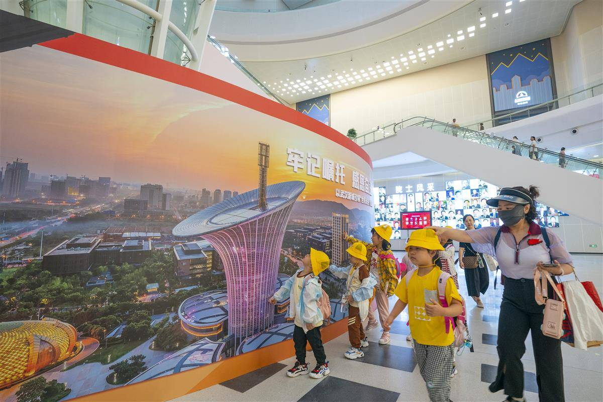7月1日,湖北省科技馆一楼大厅,观众参观武汉东湖高新区《牢记嘱托,感恩奋进——以武汉新城引领“世界光谷”建设》科技成果展。(湖北日报全媒记者 魏铼 通讯员 龙大虎 摄)