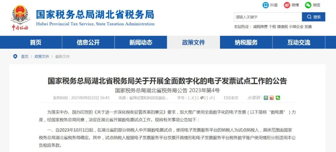 近日,国家税务总局湖北省税务局发布公告称,为落实中办、国办印发的《关于进一步深化税收征管改革的意见》要求,加大推广使用全面数字化的电子发票(以下简称“数电票”)力度,经国家税务总局同意,决定在湖北省开展数电票试点工作。