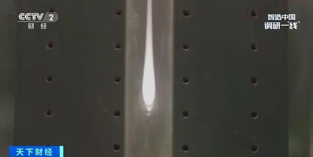 拉丝塔的顶端是产线的起点,散发着强光的装置就是光纤的拉丝炉。炉内温度高达2000摄氏度,生产光纤就像是做“拉丝糖”,要先将固体预制棒熔融软化,然后通过牵引力拉成细丝。