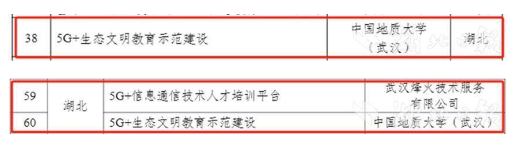 中国地质大学(武汉)“ 5G+生态文明教育示范建设”拟入选“5G+智慧教育”应用试点全国典型项目,武汉烽火技术服务有限公司“5G+信息通信技术人才培训平台”、中国地质大学(武汉)“5G+生态文明教育示范建设”拟入选“5G+智慧教育”应用试点通过验收项目。