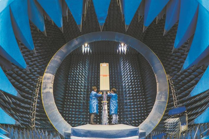中国信科集团无线产业园,技术人员在多探头球面近场检测实验室测试通信基站天线产品。 撰文:武经宣
