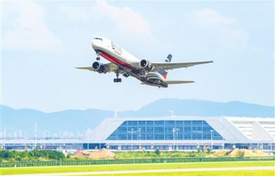 一架B767-300型全货机近日从鄂州花湖国际机场起飞,前往印度新德里。(湖北日报全媒记者 薛婷 摄)