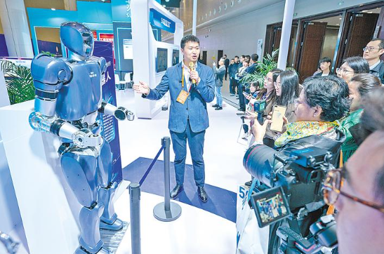 11月19日,2024中国5G+工业互联网大会成果展示区,光谷造人形机器人“劳动者1号”吸引参会嘉宾关注。(湖北日报全媒记者 魏铼 摄)