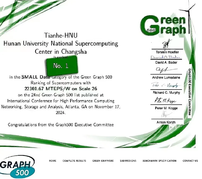 根据2024年11月最新公布的Graph 500全球排名,湖南大学国家超级计算长沙中心的“天河”超级计算机,以最强性能功耗比名列Small Data Green Graph500(小数据图计算能效)全球榜单第一。