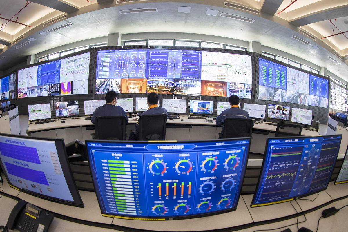 工作人员在宝武集团鄂城钢铁有限公司操业集控中心对生产现场进行远程控制。鄂钢是我省钢铁行业首家全流程超低排A级企业。(湖北日报全媒记者 柯皓 摄)