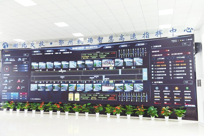 花湖国际机场高速公路指挥中心,11米长的曲面屏将整体路况“一网打尽”。(湖北日报通讯员 吴迪 摄)